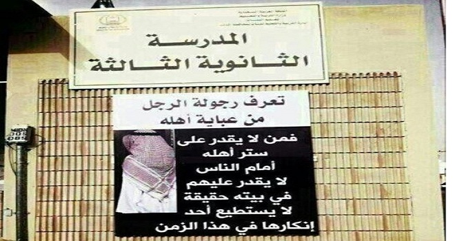 واعتبرت مدرسة بنات، عباءة النساء، معياراً للرجولة عبر لوحة علقتها على واجهة مبناها، مكتوب عليها: “تعرف رجولة الرجل من عباءة أهله، فمن لا يقدر ستر أهله أمام الناس لا يقدر عليهم في بيته، حقيقةً لا يستطيع أحد إنكارها في هذا الزمن”.
