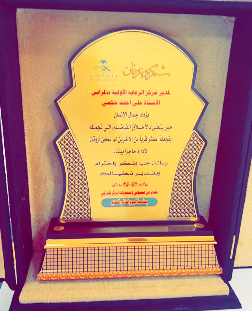 في بادرة اجتماعية وبمناسبة يوم المدير العالمي أقام مركز الرعاية الأولية الصحية بالمرابي تكريمآ لمدير المركز الاستاذ علي احمد حكمي حفلاً ، برعاية رئيس مركز الحكاميه علي العواجي