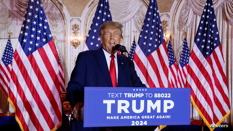 Former U.S. President Donald Trump announces that he will once again run for U.S. president in the 2024 U.S. presidential election during an event at his Mar-a-Lago estate in Palm Beach, Florida, U.S. November 15, 2022. REUTERS/Jonathan Ernst