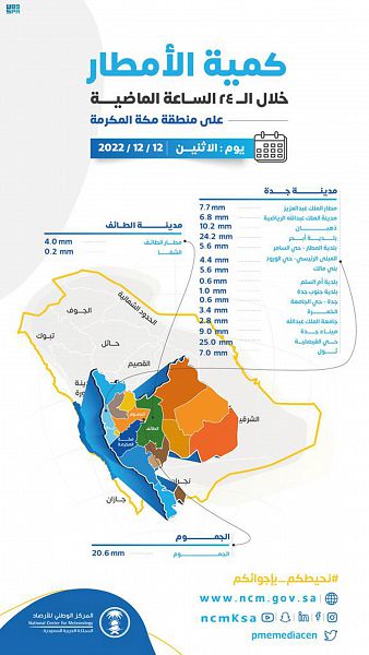 وأفاد المركز الوطني للأرصاد أن الحالة المطرية يصحبها تساقط للبرد، وتيارات هابطة نشطة السرعة، وأتربة مثارة وتدنٍ للرؤية الأفقية؛ مهيباً المركز بالجميع توخي الحيطة والحذر من المخاطر المحتملة في مثل هذه الأجواء ومتابعة معلومات الطقس عبر قنوات التواصل التي وفرها المركز على مدار الساعة، والابتعاد عن أماكن تجمع السيول والأودية وعدم محاولة تجاوزها، والالتزام بتعليمات الجهات المعنية المعلنة عبر وسائل الإعلام المختلفة ومواقع التواصل الاجتماعي.