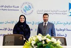 وقّعت هيئة حقوق الإنسان والمؤسسة الوطنية لحقوق الإنسان في مملكة البحرين , بمقر الهيئة في الرياض اليوم , مذكرة تفاهم للتعاون في مجال حقوق الإنسان، وقّعها من جانب الهيئة معالي رئيسة الهيئة الدكتورة هلا بنت مزيد التويجري، فيما وقّعها من جانب المؤسسة رئيسها المهندس علي أحمد الدرازي، وذلك بحضور معالي نائب رئيس الهيئة الأستاذ عبدالعزيز بن عبدالله الخيال.