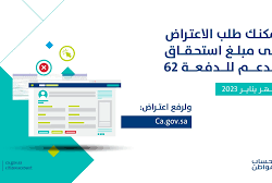 أعلن برنامج حساب المواطن اليوم (الإثنين)، عن بَدْء تلقي طلبات الاعتراض على مبالغ استحقاق الدعم للدفعة الـ62 الخاصة بشهر يناير 2023.