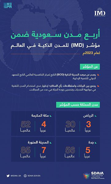 حافظت مدينة الرياض على مركزها كثالث أذكى مدينة عربية وفقاً لمؤشر IMD للمدن الذكية بالعالم لعام 2023م،الذي صدر عن المعهد الدولي للتنمية الإدارية، بينما دخل المؤشر هذا العام لأول مرة مدينتي مكة المكرمة محتلة الترتيب الرابع وجدة بالترتيب الخامس وحققت المدينة المنورة الترتيب السابع.