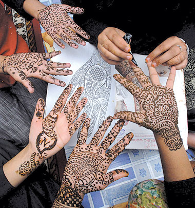 وما يميز نقش الحناء في العيد اجتماع سيدات وفتيات كل أسرة في منزل واحد لتقوم المتخصصات في النقش بالتناوب على أيادي الفتيات والنساء وتزيينها بأشكال مختلفة تسودها الحمرة الضاربة إلى السواد، ما يظهر براعة “النقاشات” المحترفات في رسم أجمل النقوش بكل روعة وجمال وإتقان.