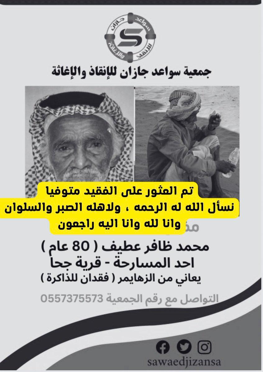 بعد بحث من كل فئات المجتمع بمنطقة جازان تعاطفا مع قصة العم محمد ظافر فقيد قرية جحا بأحد المسارحة أعلنت جمعية سواعد جازان للإنقاذ والإغاثة العثور عليه في منطقة صحراوية خالية وقد فارق الحياة