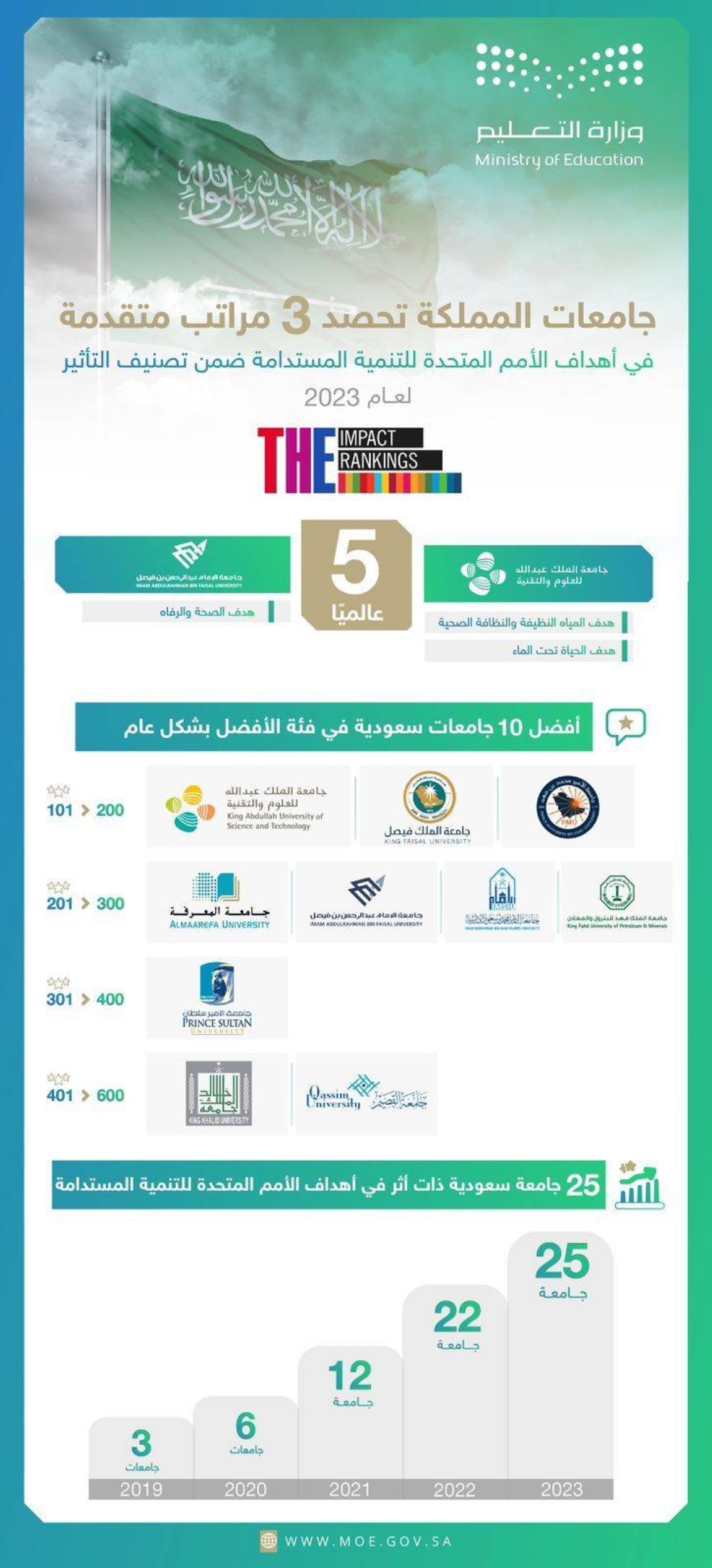 تقدَّمت المملكة ثلاث مراتب في التصنيف العالمي للجامعات ذات التأثير في تحقيق أهداف الأمم المتحدة للتنمية المستدامة لعام 2023م،حيث سجّلت الجامعات السعودية حضورها بـ 25 جامعة ضمن هذا التصنيف الدولي، مقارنةً بوجود 22 جامعة فقط العام الماضي.