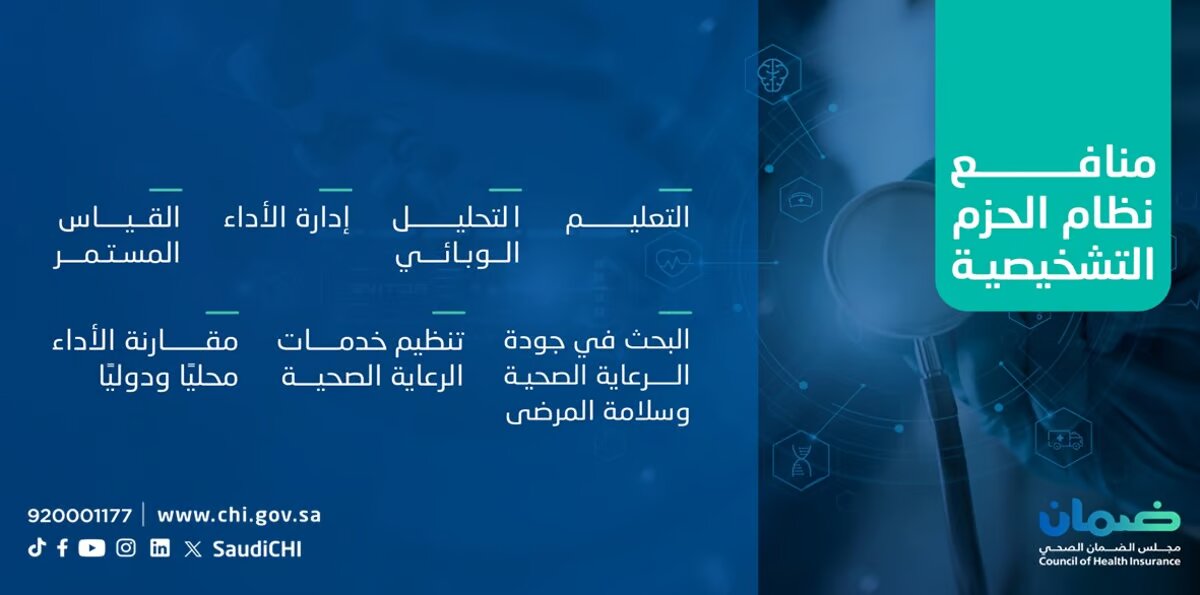 أوضح مجلس الضمان الصحي أن نظام الحزم التشخيصية يهدف إلى البحث في جودة الرعاية الصحية وسلامة المرضى، إضافةً إلى تنظيم خدمات الرعاية الصحية ومقارنة أدائها محليًا وعالميًا.