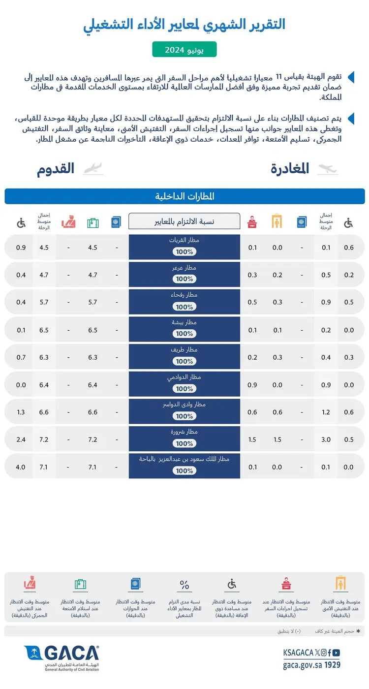 أصدرت الهيئة العامة للطيران المدني, اليوم، تقريرها الشهري عن أداء مطارات المملكة الدولية والداخلية، لشهر يونيو 2024م، وفقاً لـ11 معياراً أساسياً لقياس الأداء، وذلك تطبيقاً للتوجُّهات الإستراتيجية، التي تستهدف تجويد الخدمات المُقدَّمة للمسافرين، ورفع مستواها، وتحسين تجربة المسافر في مطارات المملكة.