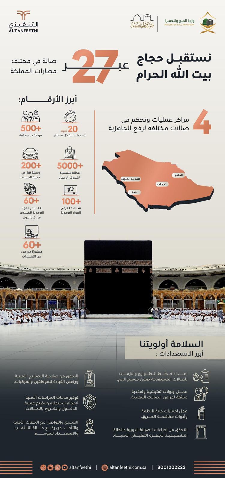 وبيّن أن “التنفيذي” تستقبل حجاج بيت الله الحرام عبر 27 صالة موزعة على مطارات المملكة، بالتعاون مع مختلف الشركاء في منظومة الطيران والقطاعات ذات العلاقة، لتسخير الجهود لخدمة الحجاج، إضافة إلى مركز تحكم موحد في الرياض ومراكز فرعية في (الرياض، وجدة، والدمام، والمدينة المنورة)، لضمان سلاسة وكفاءة العمليات التشغيلية.
