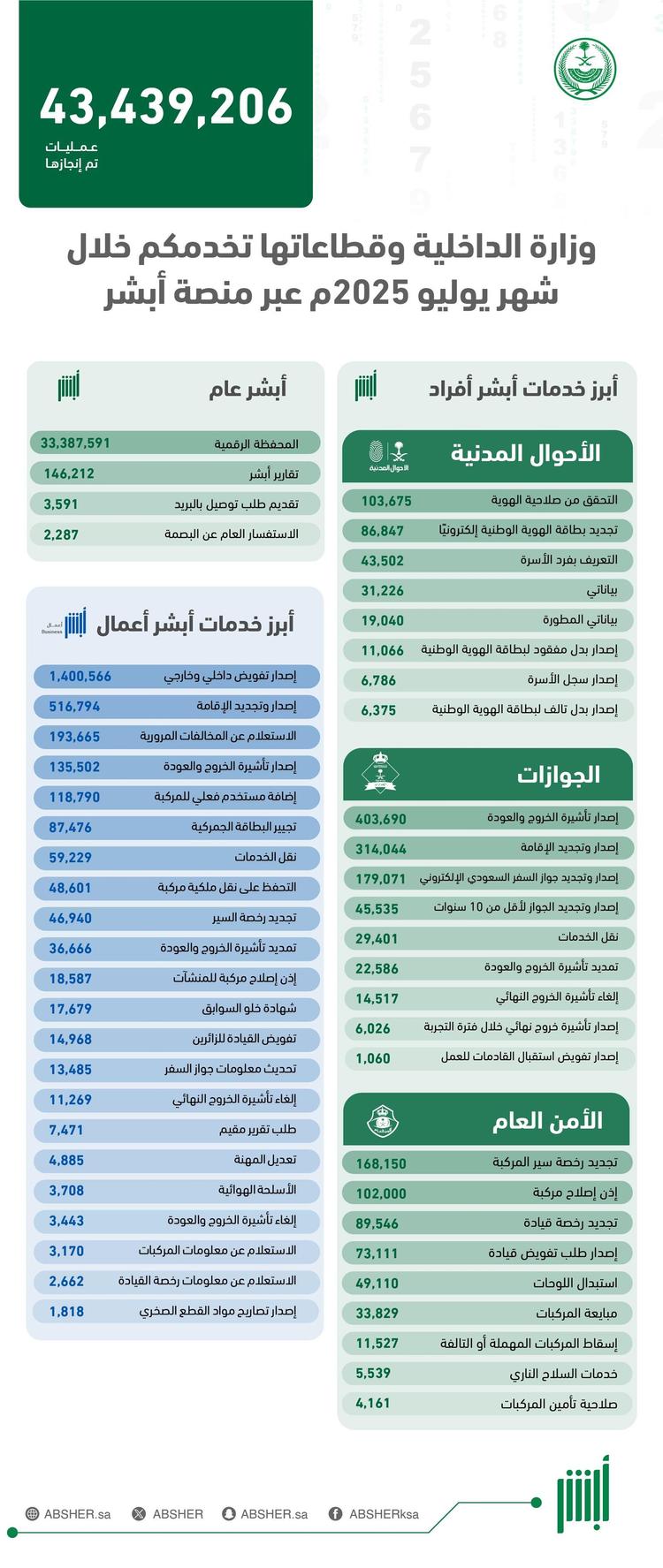 نفذت منصة وزارة الداخلية الإلكترونية “أبشر” خلال شهر يوليو الماضي (43,439,206) عمليات إلكترونية، للمستفيدين عبر أبشر أفراد وأعمال.
