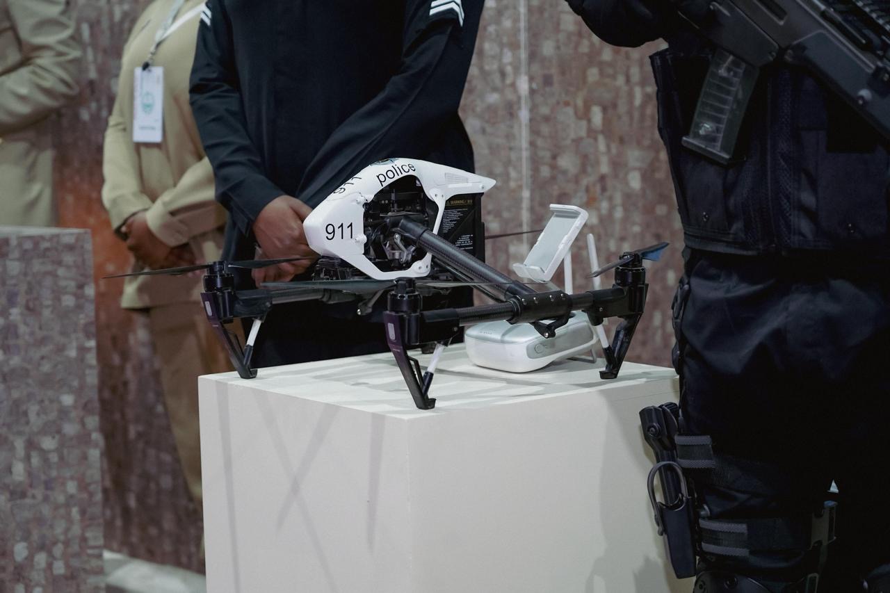 يستعرض الأمن العام لزوّار جناح وزارة الداخلية بمؤتمر ومعرض الحج، طائرة دون طيار (درون)، لرصد المخالفين لأنظمة الحج، وقياس الكثافة، بما يحقق انسيابية حركة الحشود في المشاعر المقدسة.