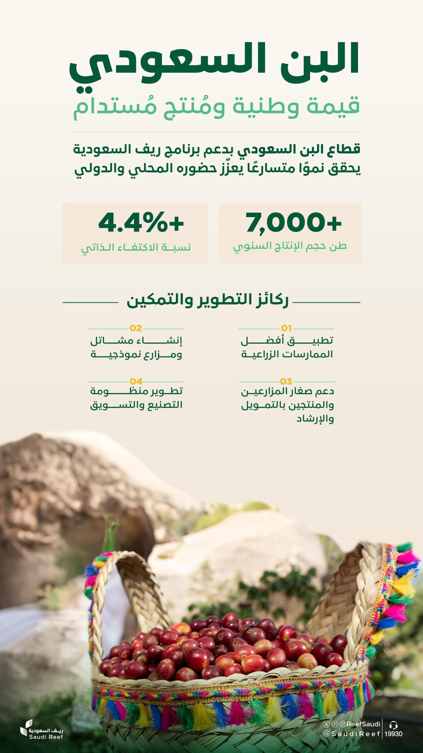 أعلن برنامج التنمية الريفية الزراعية المستدامة “ريف السعودية”، عن انطلاق البرنامج الفرعي الأول، لتطوير إنتاج وتصنيع وتسويق البن السعودي، بالتعاون مع منظمة الأغذية والزراعة للأمم المتحدة “الفاو”؛ لتعزيز إنتاج البن السعودي كأحد المحاصيل النقدية المهمة، حيث يستهدف البرنامج زيادة إنتاج البن، من 800 طن سنويًا، إلى 7 آلاف طن، ورفع نسبة الاكتفاء الذاتي من البن، من 0,5%، إلى 4,4% بنهاية العام الحالي؛ وذلك للإسهام في تعزيز الأمن الغذائي، ودعم الاقتصاد الوطني، تماشيًا مع مستهدفات رؤية السعودية 2030.
