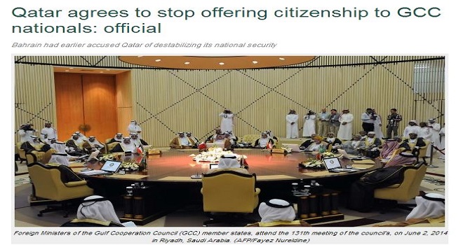 نقلت صحيفة الشرق الأوسط النسخة الإنجليزية عن مصدر دبلوماسي رفيع المستوى، قوله إن الدوحة وافقت على التوقف عن منح جنسيتها لمواطني دول مجلس التعاون الخليجي في خطوة تهدف لاحتواء الخلاف في وجهات النظر بينها وبين بقية دول المجلس، التي تتهمها بتهديد أمنها القومي .