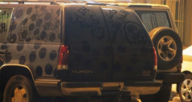 وذكر مصدر أمني أن الدوريات الأمنية ضبطت سائق مركبة من نوع “جمس يوكن” يتجول في شوارع المحافظة بعد الاشتباه فيه، وتم الاطلاع على الرموز والكتابات التي سُطِّرت على الزجاج، والتي كانت تحمل عبارات “داعش.. الدولة الإسلامية” ومقابلها باللغة الإنجليزية.