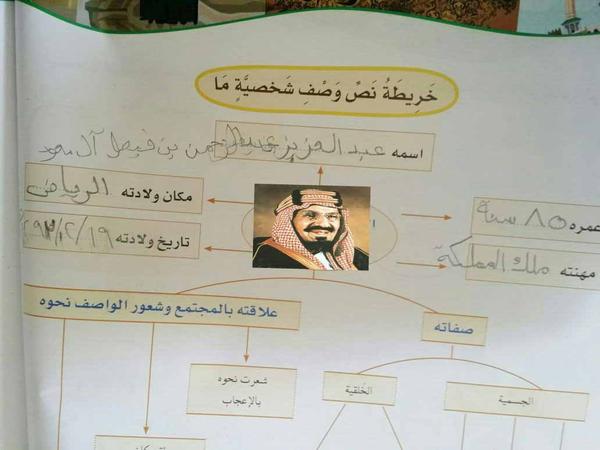 وأردف: “يعتمد الدرس على تفصيل الموصوف جسمياً وخلقياً، وقد كلفت الطلاب بالبحث عن صفات الملك المؤسس في المصادر المختلفة وكلفتهم أيضاً بإحضار صورة للمؤسس لترفق مع الدرس”.