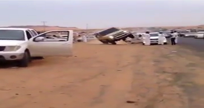 ويبدو بالفيديو ذي الـ11 ثانية، قيام سيارة جيب تسير على إطارين بصدم أحد المتفرجين برأسه مما أدى إلى سقوطه بقوة على الأرض.