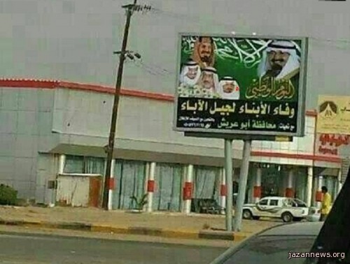 عرضت بلدية محافظة أبو عريش يافطة اعلانية خاصة بمناسبة اليوم الوطني 83 ,شمال اشارة المرور بتقاطع الطريق الدولي المؤدي لمحافظات أحد المسارحة , الحرث , صامطة , والعارضة , وحملت صور المؤسس جلالة الملك عبدالعزيز يرحمه الله , وخادم الحرمين الشريفين الملك عبدالله بن عبد العزيز , و صاحب السمو الملكي والأمير سلمان بن عبدالعزيز ولي العهد نائب رئيس مجلس الوزراء وزير الدفاع , وصاحب السمو الملكي الأمير مقرن بن عبد العزيز النائب الثاني لرئيس مجلس الوزراء , وصاحب السمو الملكي الأمير فيصل بن خالد بن عبدالعزيز أمير منطقة عسير !