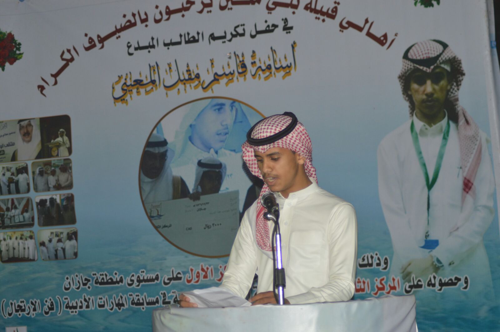 احتفت قبيلة بني معين بابنها الطالب/أسامة بن قاسم مقبل المعيني وذلك بمناسبة حصوله على المركز الأول على مستوى منطقة جازان والمركزالثاني على مستوى المملكة العربية السعودية بمسابقة “فن الارتجال” وأُقيم الحفل في قرية الظهراني بجبل بني معين وذلك مساء الجمعة الماضي الموافق ١٤٣٧/٢/٢٩ تحت إعداد وتقديم وإشراف مجلس شباب قبيلة بني معين تخلله العديد من الفقرات.