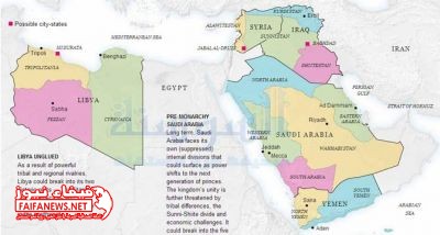 واما السعودية فقالت الصحيفة سيتم تقسيمها الى خمس دول، وفقا لاعتبارات قبلية وطائفية .