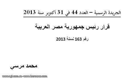 نشرت الجريدة الرسمية المصرية فى عددها الصادر اليوم الخميس قرارا بتوقيع الرئيس السابق محمد مرسي، حمل رقم 163 لسنة 2013.