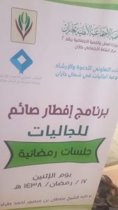 اقام مركز النشاط الاجتماعي بجازان التابع للجنة التنمية الاجتماعية بجازان بالتعاون مع المكتب التعاوني للدعوة بشمال جازان وبرعاية كريمة من الشيخ/سلطان بن منصور طراد برنامج (جلسات رمضانيه) افطار جماعي للجاليات وكان عدد الحضور فيه 400 شخص وتكلل البرنامج بالمسابقات الثقافيه والدينيه للدعاة واسلم في هذا البرنامج شخص من الجالية الفلبينيه وكذلك كلمة لرئيس لجنة التنمية/ سراج دخن اثنى فيها على الجهود الطيبه التي يبذلها الشيخ سلطان بدعمه للبرنامج المجتمعية التي تهم المجتمع كلمة للمدير التنفيذي للمكتب التعاوني بشمال الشيخ/علي الشهري شكر فيها القائمين على هذا البرنامج والجهود الطيبه التي يقدمها الشيخ في دعم برامج المكتب .