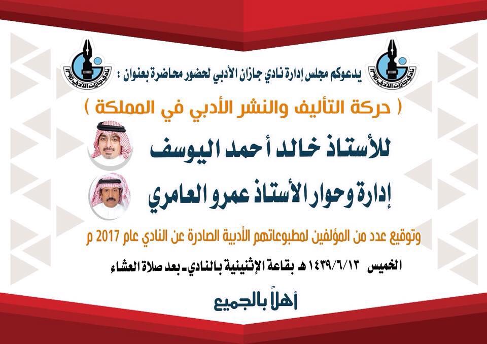 ينظم نادي جازان الأدبي غدًا الخميس12 جمادى الآخرة 1439هـ الموافق 28 فبراير 2018م ، محاضرة بعنوان ” حركة التأليف والنشر الأدبي في المملكة ” ، يُقدمها خالد بن أحمد اليوسف ، وذلك بقاعة الإثنينية بمقر النادي .