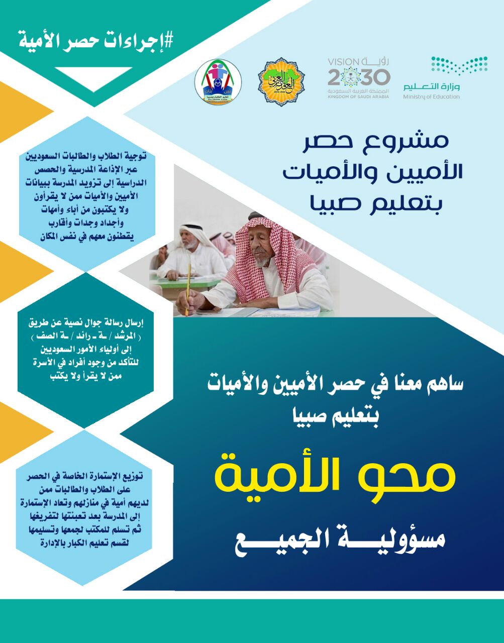جاء ذلك من خلال التعميم الذي وجهته الإدارة وحثت من خلاله المدارس للإسهام في عملية الحصر والدعوة إلى هذا المشروع عبر جملة من الإجراءات، كالاستفادة من التقنية الحديثة إضافة لبث الرسائل النصية واستخدام وسائل التواصل الاجتماعي وتوزيع استمارات المسح على الطلاب والطالبات وحثهم من خلال الإذاعة المدرسية وغيرها من الوسائل المتاحة لتزويد إدارة المدرسة بأسماء أقاربهم من الأميين والأميات، تمهيداً للرفع بنتائج المسح لمكتب التعليم ثم للقسم المختص بالإدارة.