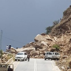وفي جبال الحشر التابعة للمحافظة ذاتها تسبب انهيار صخري كبير في عزل جنوب مركز جبال الحشر عن شماله منذ أمس، فيما تباشر آليات ومعدات وزارة النقل فتح الطريق وإزالة تراكمات الانهيار الضخم الذي قطع الحركة حتى فتحت المعدات جانبًا صغيرًا للحركة.