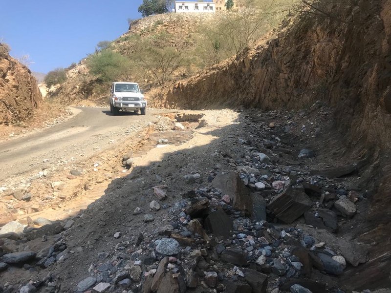 وفي جبال الحشر التابعة للمحافظة ذاتها تسبب انهيار صخري كبير في عزل جنوب مركز جبال الحشر عن شماله منذ أمس، فيما تباشر آليات ومعدات وزارة النقل فتح الطريق وإزالة تراكمات الانهيار الضخم الذي قطع الحركة حتى فتحت المعدات جانبًا صغيرًا للحركة.