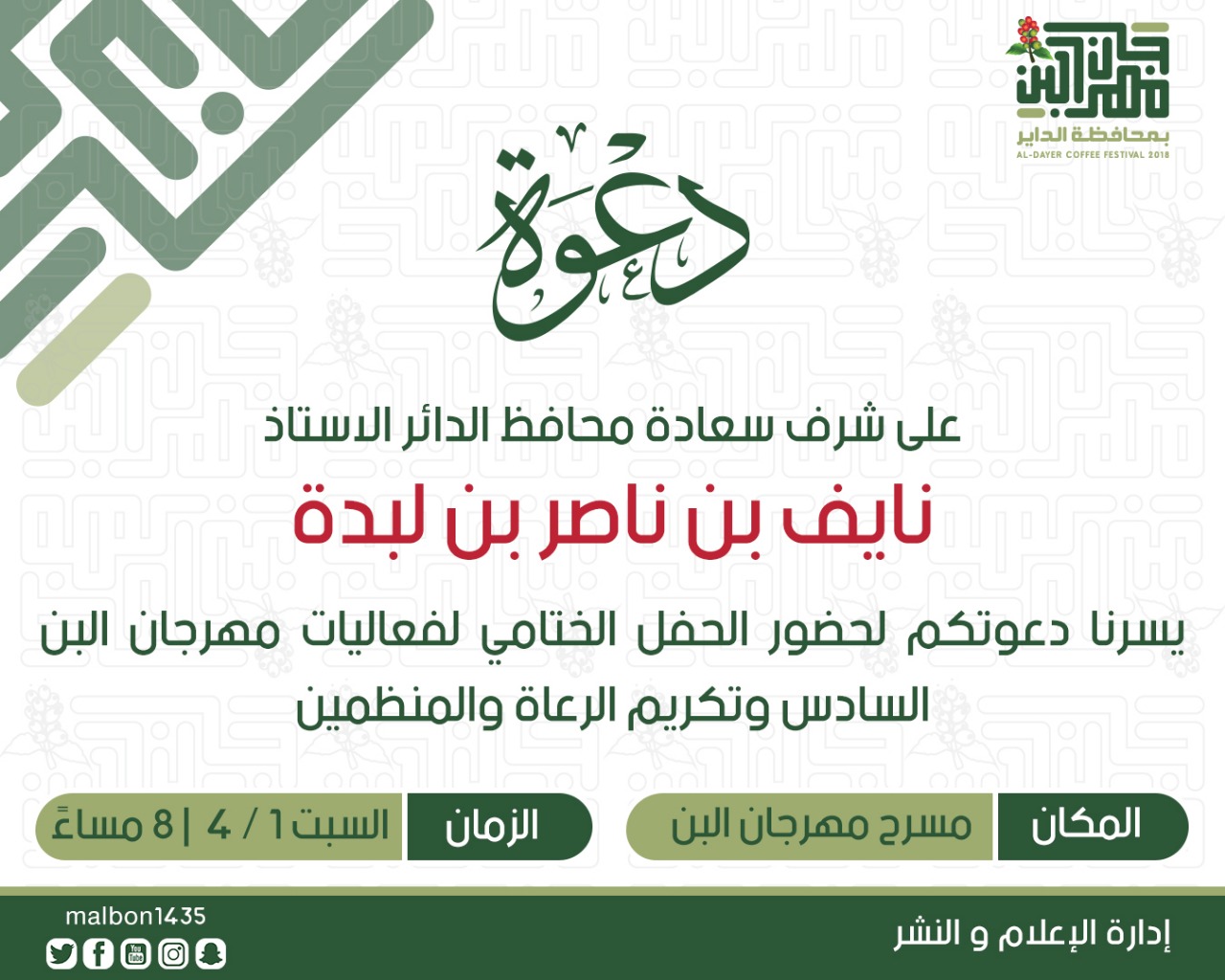 تدعو إدارة مهرجان البن السادس بالداير زوار المهرجان ومحبي البن الخولاني الأصيل لحضور الحفل الختامي لفعاليات المهرجان وتكريم الرعاة والمنظمين على شرف سعادة محافظ الداير الأستاذ نايف بن ناصر بن لبدة.