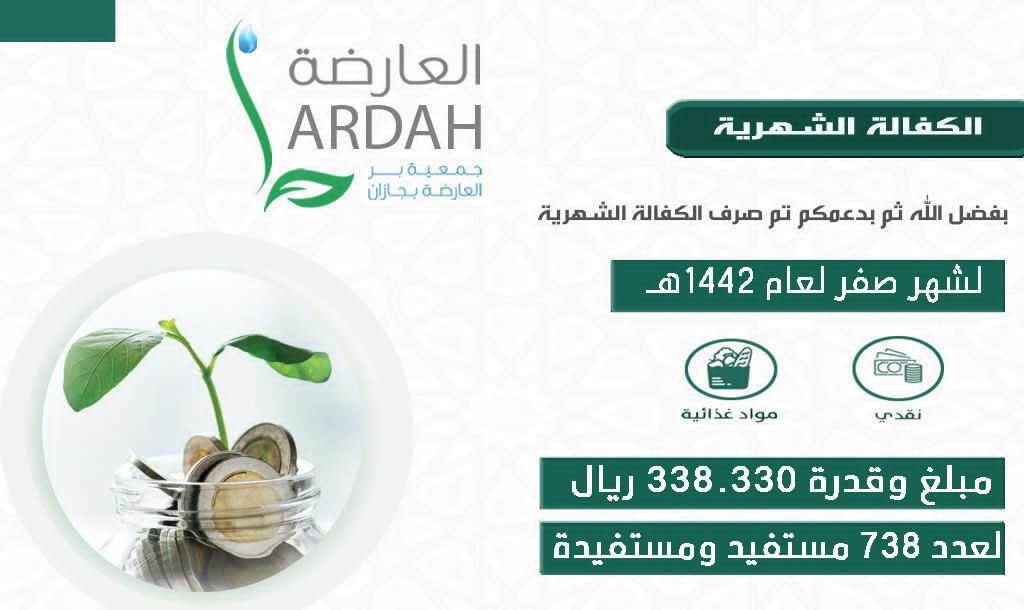 صرفت جمعية البر الخيرية بالعارضة بجازان مبلغ وقده(338.330) الف ريال لعدد (738) أسرة وذلك لمشروع كفالة الأسر “السلة الغذائية” الشهرية لشهر صفر 1442هـ.