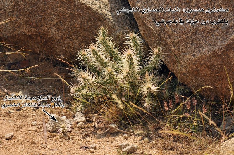 وأضاف: هذا النبات عبارة عن سوق عصارية شوكية، قد يرتفع لنحو المتر، تتوزع الأشواك به على الساق في نمط كثيف، ويحوي النبات نمطين من الأشواك: كبيرة بطول يتراوح من 1 – 7 سم ، ونمط آخر دقيق لا يتعدى نصف ملليمتر في الطول.