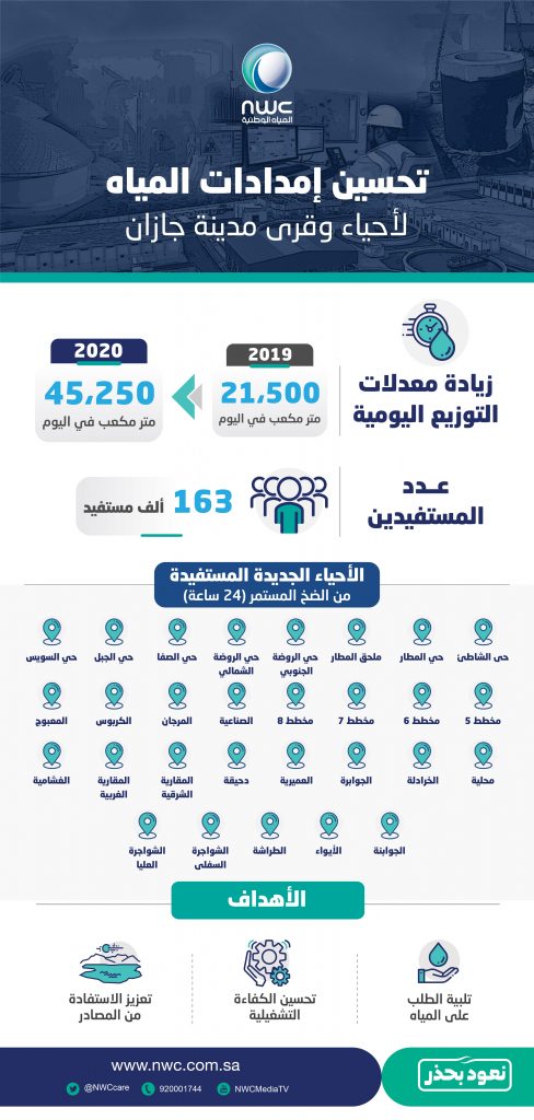 وقال جبر: “تم رفع كميات الضخ خلال عام 2020 إلى أكثر من 45 ألف متر مكعب يوميًا بدلاً من 21 ألف متر كعب في عام 2019″، مشيرًا إلى أن الأحياء الجديدة المستفيدة من الضخ المستمر (24 ساعة) في محافظة جازان والقرى التابعة لها هي: حي الشاطئ والمطار وملحق المطار والروضة الشمالية والجنوبية والصفا والجبل والسويس ومخططات (5 و6 و7 و8) والصناعية والمرجان وقرى الكربوس والمعبوج ومحلية والخرادلة والجوابرة والعميرية ودحيقة والمقارية الشرقية والغربية والغشامية والجوابنة والأيواء والطراشة والشواجرة السفلى والعليا.