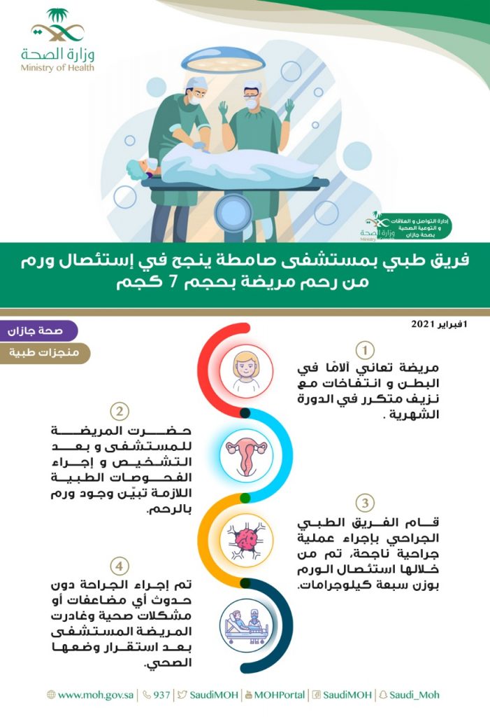 قالت صحة جازان بأن فريق طبي بمستشفى صامطة العام نجح في استئصال ورم ليفي من رحم مريضة كانت تعاني آلامًا في البطن وانتفاخات مع نزيف متكرر في الدورة الشهرية .