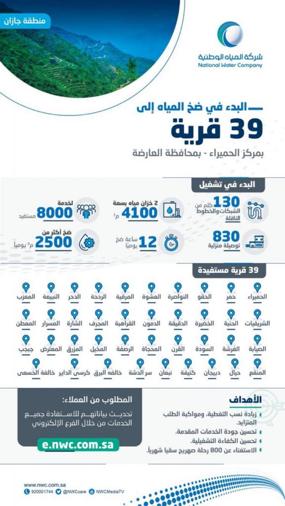 بدأت شركة المياه الوطنية، ممثلة بالإدارة العامة لخدمات المياه بمنطقة جازان في تشغيل شبكات المياه في 39 قرية بمركز الحميراء بمحافظة العارضة.