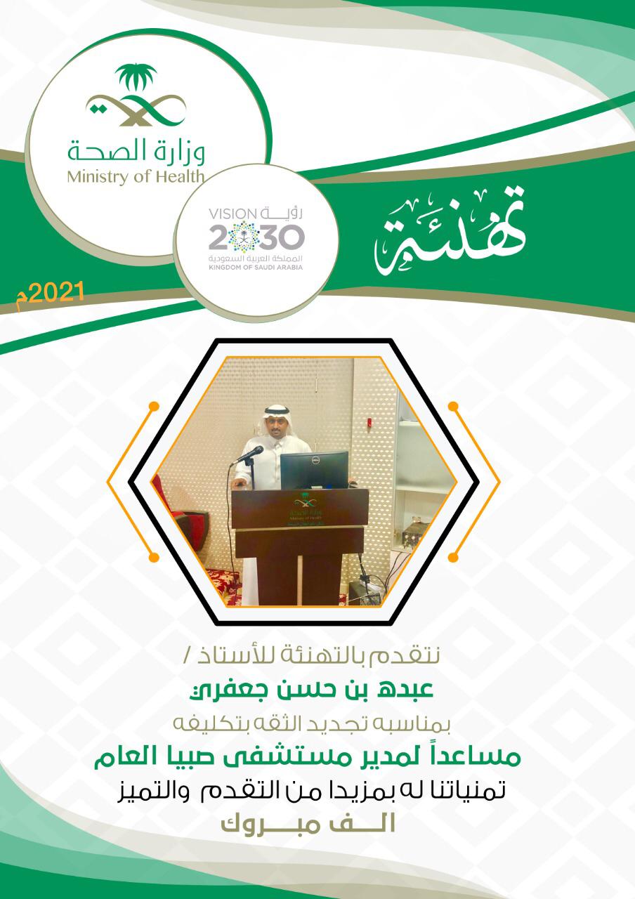 أصدر مدير مستشفى صبيا العام د علي بن سعيد الاحمري قراراً بتمديد تكليف عبده بن حسن جعفري، مساعداً لمدير مستشفى صبيا العام.