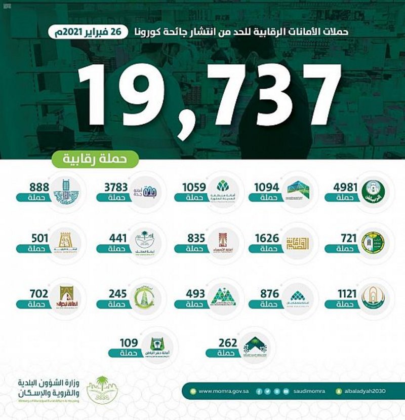 كثّفت وزارة الشؤون البلدية والقروية والإسكان -ممثلة في الأمانات والبلديات التابعة لها بجميع مناطق ومدن المملكة- جولاتها الميدانية على المنشآت الغذائية والمراكز التجارية وأماكن سكن العمالة؛ لمتابعة مدى تطبيقها وتقيدها بالإجراءات الاحترازية والوقائية من فيروس ‎كورونا؛ حيث قامت الفِرَق الرقابية في القطاع البلدي بمباشرة (19737) جولة رقابية وتفتيشية، أسفرت عن تسجيل (846) مخالفة وإغلاق (263) محلًّا تجاريًّا احترازيًّا؛ لمخالفتها الاشتراطات البلدية؛ وذلك خلال يوم أمس الجمعة 26 فبراير 2021.