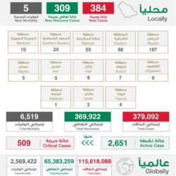 وقالت الوزارة إنه تم تسجيل 309 حالات تعافٍ جديدة ليصبح الإجمالي 396922 حالة ولله الحمد.