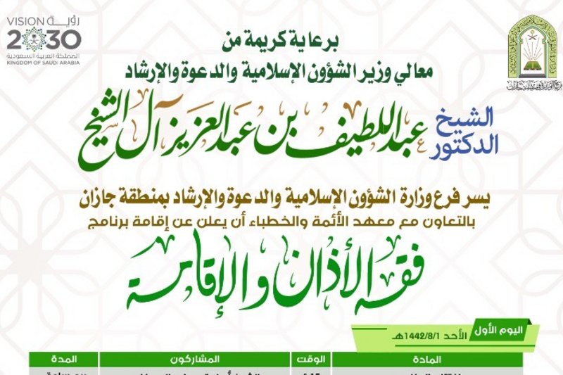 ينظم فرع وزارة الشؤون الإسلامية والدعوة والإرشاد بمنطقة جازان البرنامج العلمي (فقه الأذان والإقامة)، برعاية وزير الشؤون الإسلامية والدعوة والإرشاد الشيخ الدكتور عبد اللطيف بن عبد العزيز آل الشيخ، وبالتعاون مع معهد الأئمة والخطباء الذي يفتتحه فضيلة مدير عام الفرع الشيخ أسامة بن زيد مدخلي، مساء الأحد غرة شهر شعبان ١٤٤٢ هجري، بكلمة عنوانها (أهمية توحيد الألوهية وفضله)، ثم تنطلق بقية محاضرات البرنامج الذي يشارك فيه نخبة من المشايخ والمختصين من دعاة المنطقة، ويستمر لخمسة أيام.