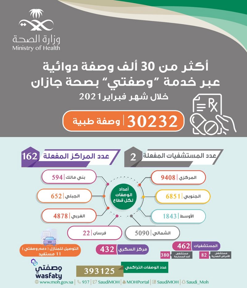 قالت “صحة جازان” إنه تم صرف 30232 وصفة طيبة خلال فبراير 2021م، عن طريق خدمة “وصفتي” لعدد من المستشفيات والمراكز الصحية البالغ عددها 162 مركزاً.