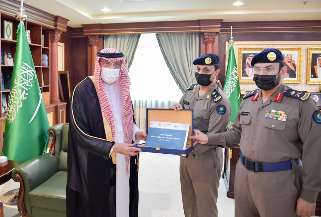 كما تسلم التقرير السنوي لإنجازات الدفاع المدني بمنطقة جازان لعام 2020 الذي اشتمل على جهود المديرية والإدارات التابعة لها والتطوير الذي حصل في خدمات الدفاع المدني والحالات والحوادث التي تمت مباشرتها والبرامج التوعوية وخطط الكشف الوقائي لتطبيق انظمة ومتطلبات السلامة والمبادرات التي تم اعتمادها