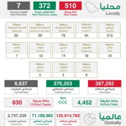 وقالت الوزارة إنه تم تسجيل 372 حالة تعافٍ جديدة ليصبح الإجمالي 376203 حالة ولله الحمد.