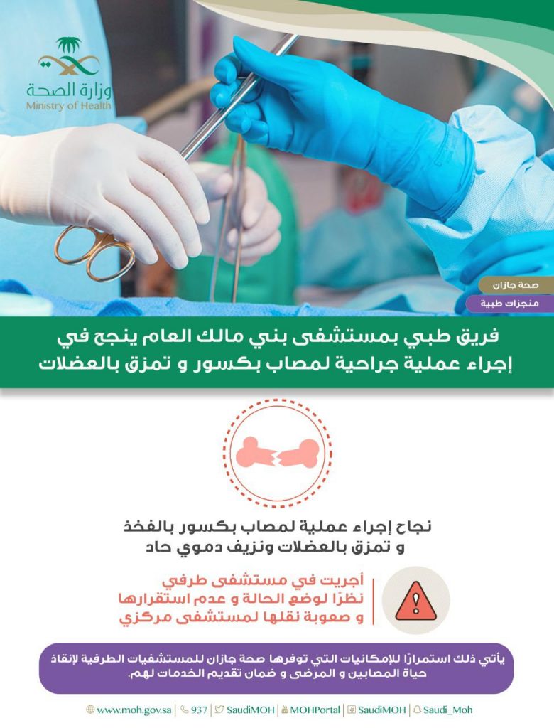 ذكرت صحة جازان بأن فريق طبي بمستشفى بني مالك العام نجح في إجراء عملية لمصاب بكسور بالفخذ وتمزق بالعضلات ونزيف دموي حاد.
