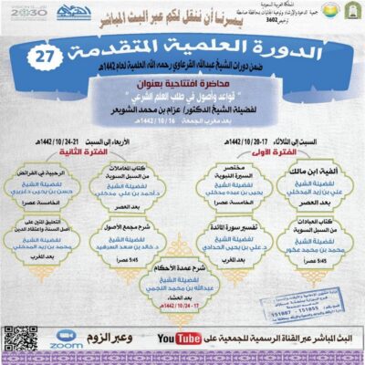 وتفصيلاً، يأتي ذلك بتنظيم من فرع وزارة الشؤون الإسلامية بمنطقة جازان وبالتعاون مع جمعية الدعوة والإرشاد وتوعية الجاليات بمحافظة صامطة، وتنقل عن بعد عبر البث المباشر لقنوات الجمعية على منصة التواصل الاجتماعي اليوتيوب https://youtube.com/channel/UC61hb9u7edJ_qf4ka2F-tkQ ، وعبر تطبيق zoom