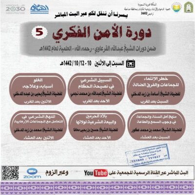 وأكد “المدخلي” أن الدورة يقدمها مشايخ فضلاء حاثًا طلبة العلم وأئمة وخطباء المساجد على حضور هذه الدورات عن بعد لأهميتها وللاستفادة مما سيُطرح فيها من عناصر مهمة لطلاب العلم والدعاة والأئمة.