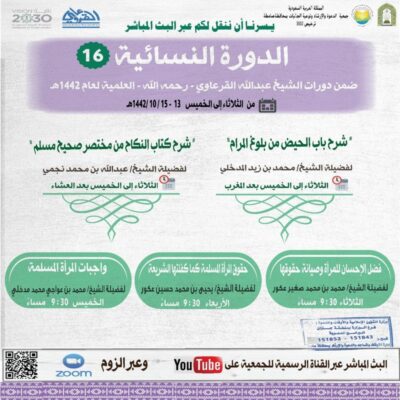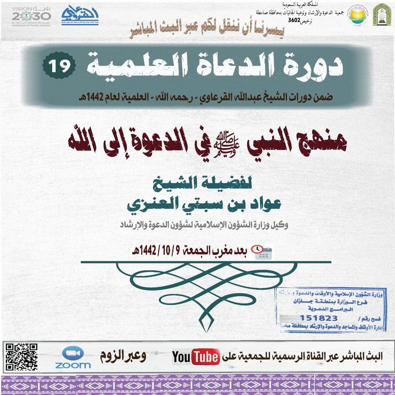وتفصيلاً، يأتي ذلك بتنظيم من فرع وزارة الشؤون الإسلامية بمنطقة جازان وبالتعاون مع جمعية الدعوة والإرشاد وتوعية الجاليات بمحافظة صامطة، وتنقل عن بعد عبر البث المباشر لقنوات الجمعية على منصة التواصل الاجتماعي اليوتيوب https://youtube.com/channel/UC61hb9u7edJ_qf4ka2F-tkQ ، وعبر تطبيق zoom
