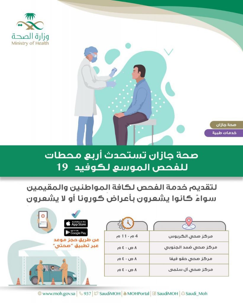 أعلنت صحة جازان عن بدء العمل في 4 محطات للفحص الموسع لفايروس كورونا “كوفيد 19 ” وذلك لتقديم خدمة الفحص لكافة المواطنين والمقيمين.
