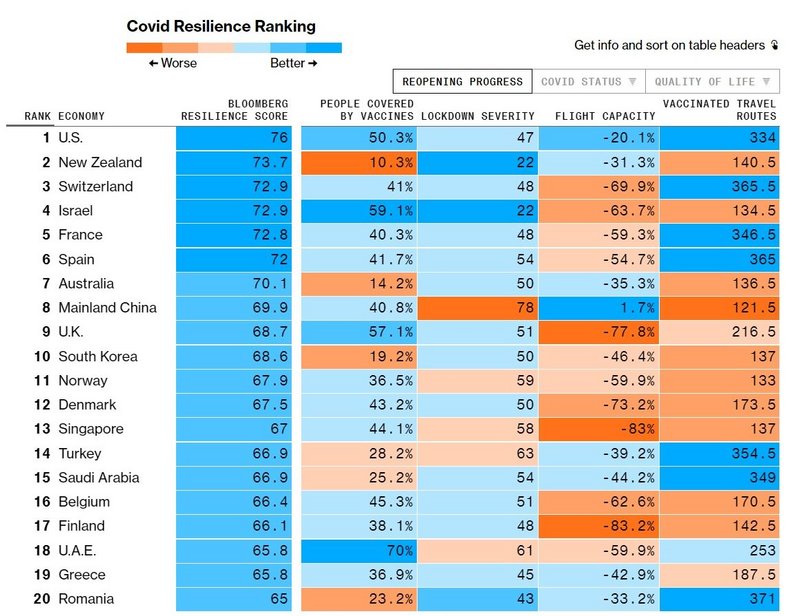 وتفصيلًا: اعتمدت بلومبيرغ في تقييمها على عدة مقاييس؛ مثل: مدى انفتاح الاقتصاد على العالم، وسهولة التنقل داخل وخارج البلاد، ونسبة الوفيات إلى عدد الإصابات، بالإضافة إلى حرية الحركة وتعافي قطاع الطيران.