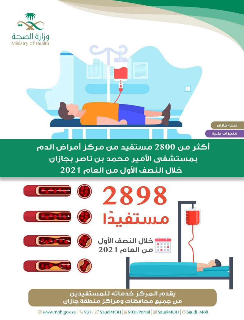 بلغ عدد المستفيدين من مركز أمراض الدم بمستشفى الأمير محمد بن ناصر بجازان 2898 مستفيد خلال النصف الأول من العام 2021 م