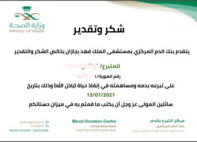 أطلق قسم المختبر وبنك الدم بمستشفى الملك فهد المركزي بجازان، اليوم، خدمة إرسال شهادات الشكر للمتبرع بالدم، عبر البريد الإلكتروني.
